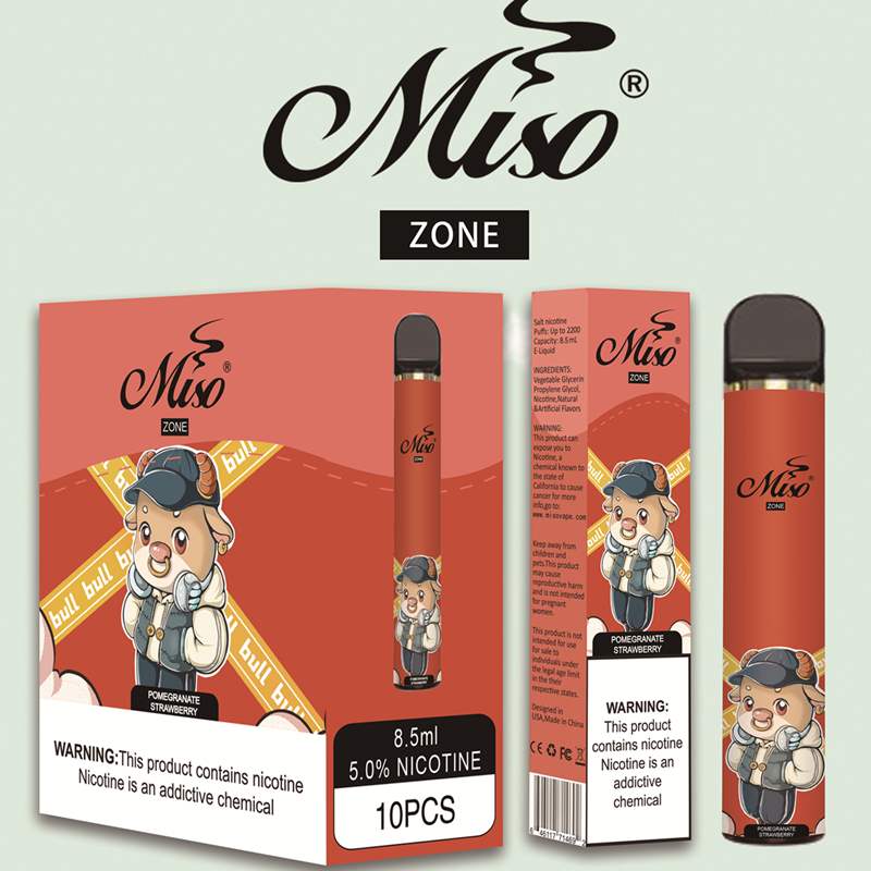 Product Name: MISO Zone Disposable Vape Weight: 60g Battery Capacity: 950mAh Pod Capacity: 8.5ml Puff Times: Around 2200 Puffs Nicotine Strength: 5% Flavors 1. Apple Blue Razz 2. Strawberry Kiwi Lemonade 3. Cherry Lemonade 4. Watermelon Peach Pear 5. Pear Cotton Candy Ice 6. Pome Granate Strawberry 7. Russian Cream 8. Watermelon Lemonade 9. Strawberry Milk 10. Red Apple Melon Ice 11. Watermelon Peach Mango 12. Watermelon Ice Package: 10 pcs each Display Box