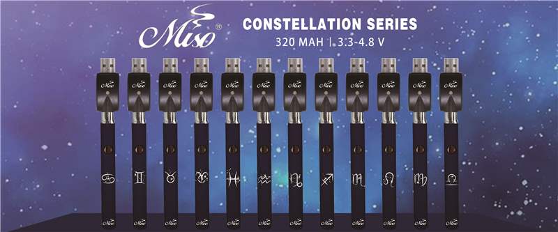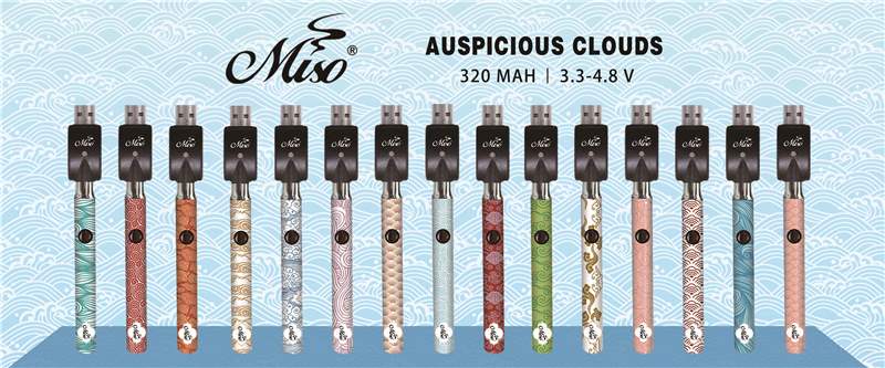 Product Name: Miso 510 Thread Battery Auspicious Clouds Series Battery Capacity: 320mAh Voltage Range:3.3--4.8V Thread: 510 Thread Charger: USB Charger Colors:15 Different Colors